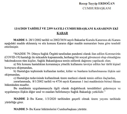 Alınan karara göre, Dünya Sağlık Örgütü tarafından pandemi olarak ilan edilen koronavirüs (Kovid-19) hastalığı ile mücadele kapsamında, herhangi bir sosyal güvencesi olup olmadığına bakılmaksızın tüm kişiler, Sağlık Bakanlığınca temin edilerek dağıtımı yapılacak olan söz konusu hastalıktan korunmaya yönelik kullanımı tavsiye edilen her türlü kişisel koruyucu ekipmandan, hastalığın teşhisinde kullanılan testler, kitler ve bunların kullanılmasına ilişkin sair ekipmandan, hastalığın tedavisinde kullanılmak üzere merkezi olarak temin edilen ilaçlardan, sosyal güvencesine bakılmaksızın ücretsiz olarak yararlanılacak.
