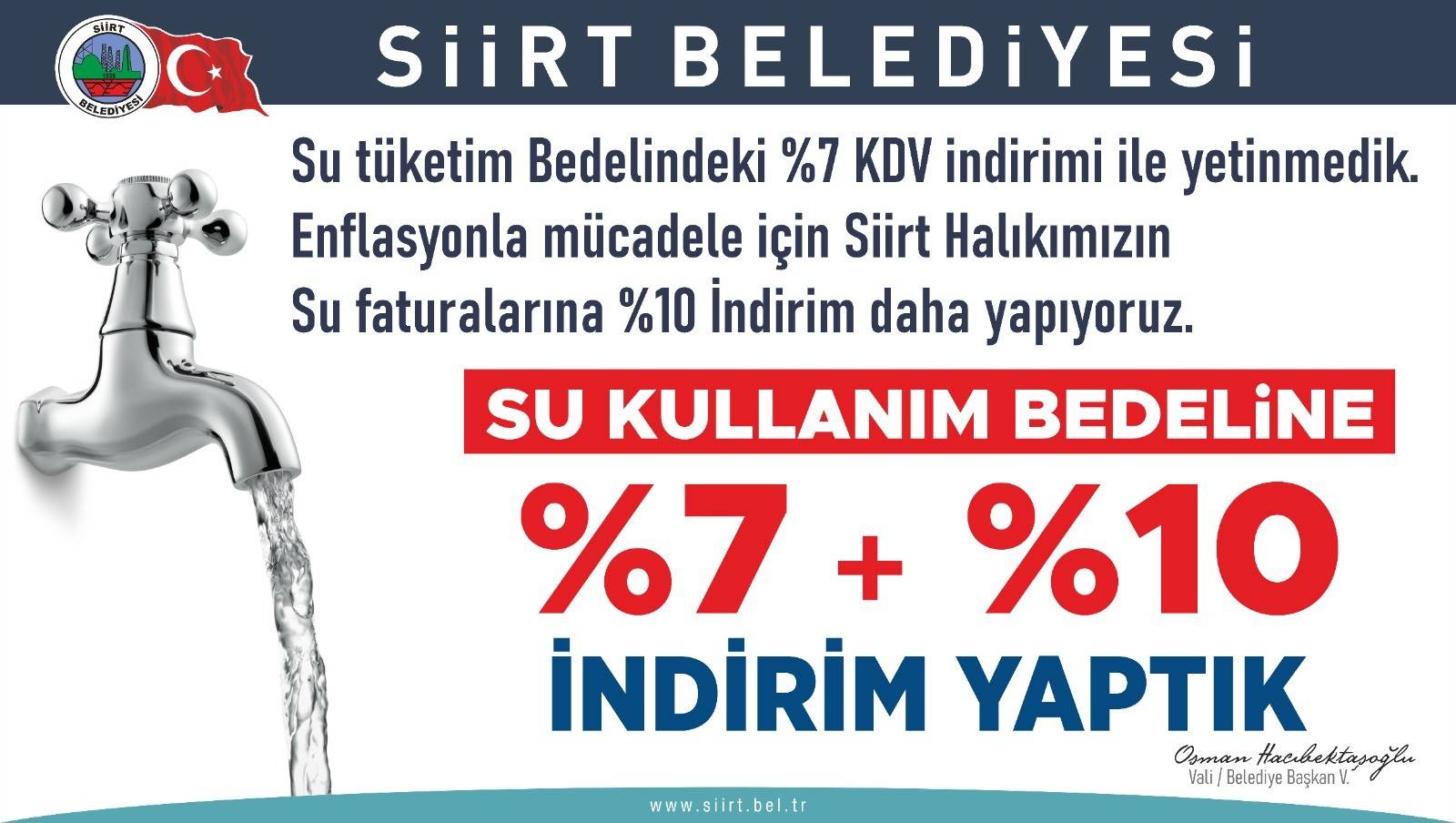 Siirt Belediye Başkanlığı mesken, iş yeri, sanayi, inşaat başta olmak üzere tüm abone Su tariflerinde yüzde 7 KDV indirimine ilave olarak Belediye Meclisi’nde su tarifelerinde yüzde (10) daha indirim kararı alarak, sosyal Belediyecilik anlayışıyla kentte su fiyatlarında yüzde (17) ’lik indirim yaptı.