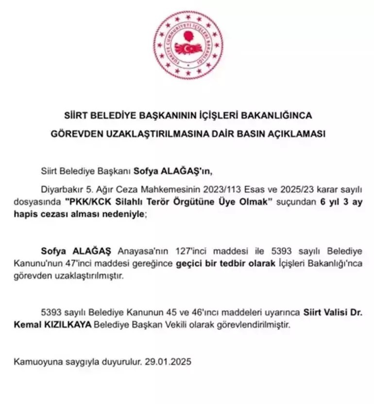 Bakanlıktan yapılan yazılı açıklamada, "Siirt Belediye Başkanı Sofya Alağaş'ın, Diyarbakır 5'inci Ağır Ceza Mahkemesi'nin 2023/113 esas ve 2025/23 karar sayılı dosyasında 'PKK/KCK silahlı terör örgütüne üye olmak' suçundan 6 yıl 3 ay hapis cezası alması nedeniyle; Sofya Alağaş Anayasa'nın 127'inci maddesi ile 5393 sayılı Belediye Kanunu'nun 47'inci maddesi gereğince geçici bir tedbir olarak İçişleri Bakanlığı'nca görevden uzaklaştırılmıştır.