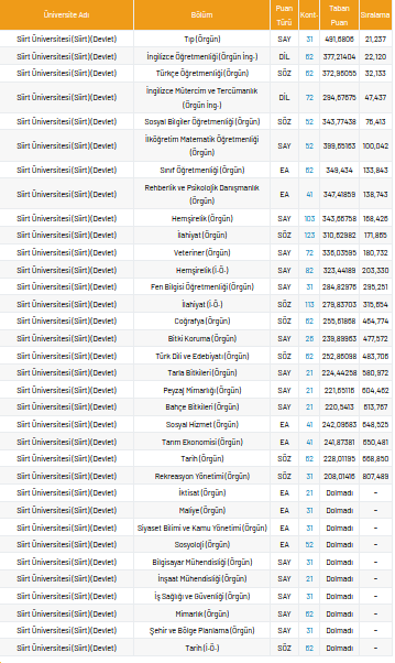 Siirt Üniversitesi 4 yıllık taban puanları 2021, yüzdelik dilimleri ve kontenjan sayıları kaçtır?