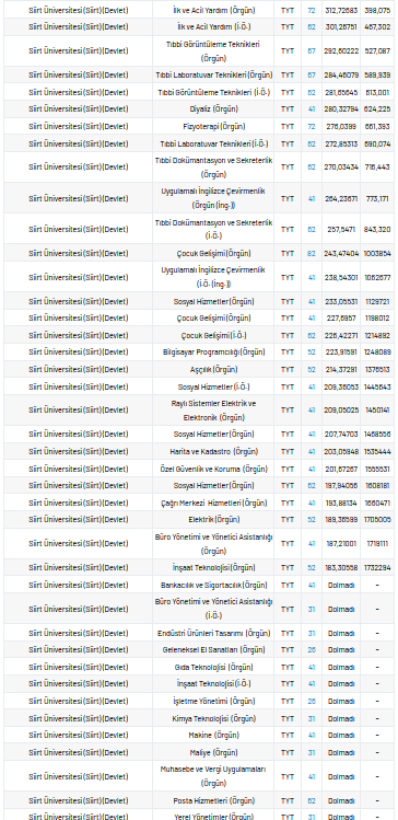 Siirt Üniversitesi 2 yıllık taban puanları 2021, yüzdelik dilimleri ve kontenjan sayıları kaçtır?