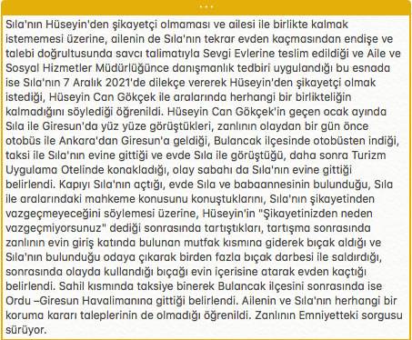 Giresun Valisi Enver Ünlü, Twitter hesabından yaptığı paylaşımda, "Bugün bir cani tarafından hayattan koparılan Sıla Şentürk kızımızı kaybetmenin acısını yaşıyoruz. Cinayet zanlısı kısa sürede yakalanarak gözaltına alındı, süreci hassasiyetle takip ediyoruz" dedi. Giresun'un Erikliman köyünde babaannesinin evinde kalan Sıla Şentürk'ün Gökçek tarafından bir kavga sonucu öldürüldüğü aktarıldı.