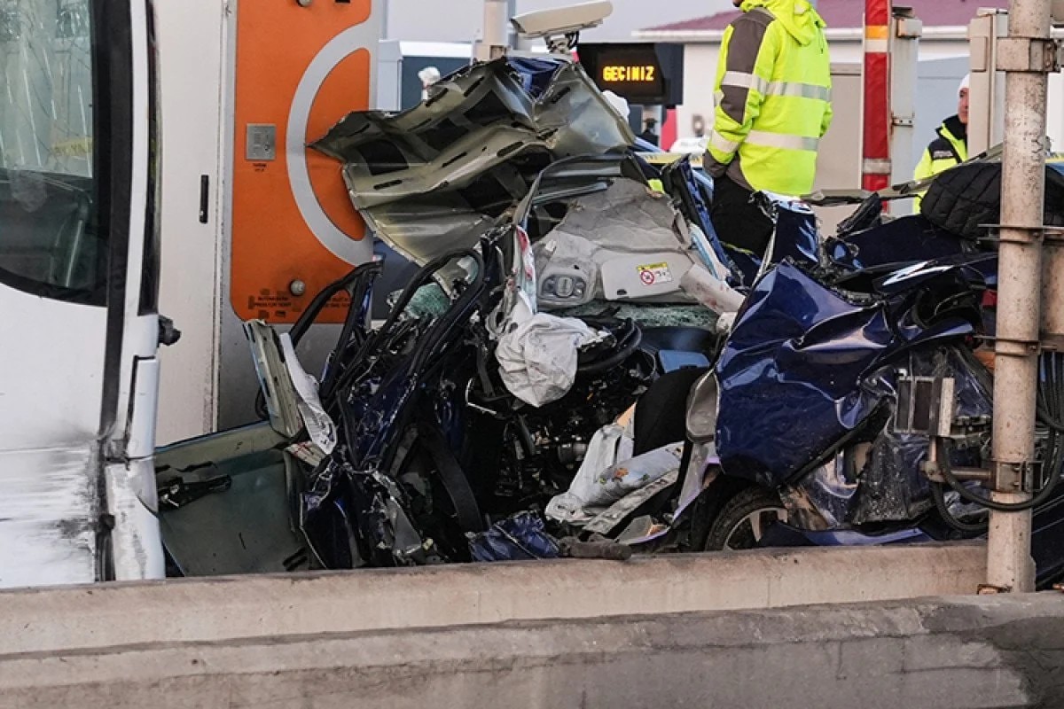 Aynı istikamette seyreden bir yolcu otobüsü, gişelere girmeye çalışan otomobile arkadan çarptı. Çarpmanın şiddetiyle otomobil, beton gişe bloğu ile otobüs arasında feci şekilde sıkıştı.