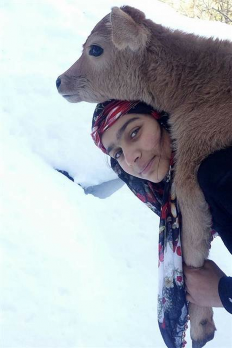 Rize'nin İkizdere İlçesi'nde yeni doğum yapan keçiyi sırtına aldığı fotoğrafın sosyal medyada yayılmasıyla gündeme gelen Hamdu Sena Bilgin (12), hasta buzağısı ile bir fotoğraf paylaştı.