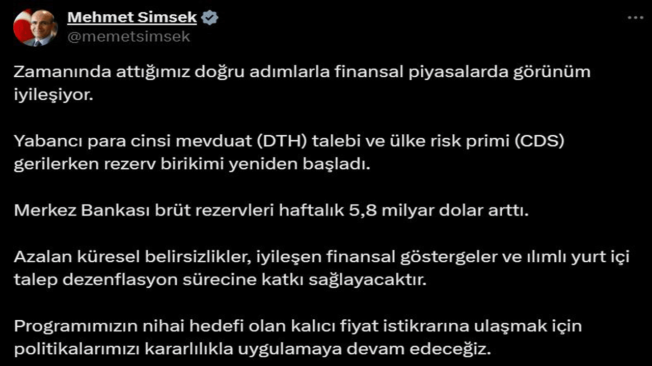 "Merkez Bankası brüt rezervleri haftalık 5,8 milyar dolar arttı. Azalan küresel belirsizlikler, iyileşen finansal göstergeler ve ılımlı yurt içi talep dezenflasyon sürecine katkı sağlayacaktır. Programımızın nihai hedefi olan kalıcı fiyat istikrarına ulaşmak için politikalarımızı kararlılıkla uygulamaya devam edeceğiz" ifadelerini kullandı.