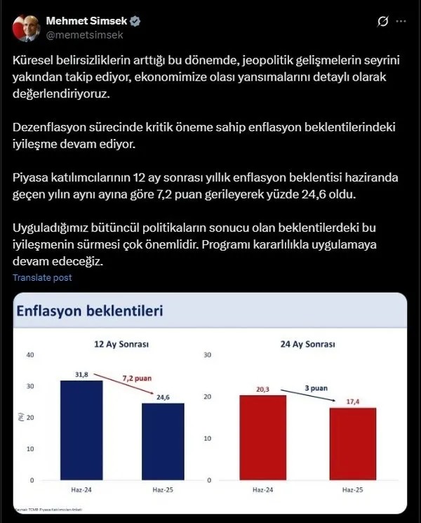 Hazine ve Maliye Bakanı Mehmet Şimşek, sosyal medya hesabından enflasyon beklentileri ve dezenflasyon sürecine yönelik önemli değerlendirmelerde bulundu.