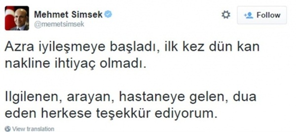 Maliye Bakanı Mehmet Şimşek'in yoğun bakımda olan kızı Azra'dan müjdeli haber geldi. Şimşek, resmi Twitter hesabından yaptığı açıklamada, "Azra iyileşmeye başladı, ilk kez dün kan nakline ihtiyaç olmadı. İlgilenen, arayan, hastaneye gelen, dua eden herkese teşekkür ediyorum." ifadelerini kullandı.