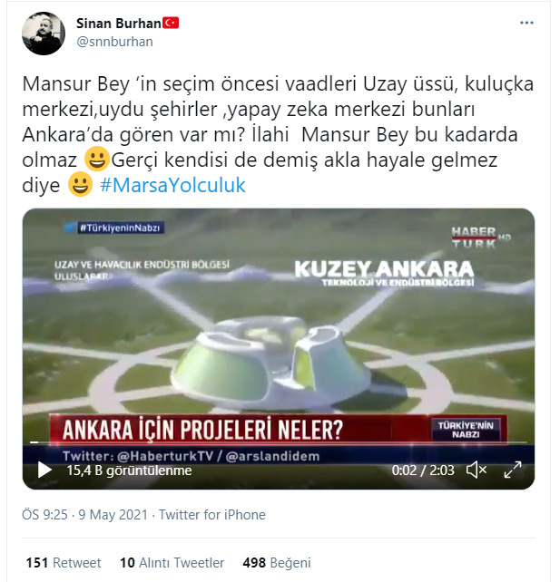 2019 yerel seçimleri öncesinde Habertürk canlı yayınında vaatlerini anlatan CHP'li Ankara Büyükşehir Belediye Başkanı Mansur Yavaş, 'Uzay Üssü' projesinin sözünü vermişti. Ankara'yı 2050 yılının 'yapay zeka'lı dünyasına hazırlayacağını iddia eden CHP'li Yavaş, başkan seçildikten sonra ise projesini yerine getirmek bir yana, adını bile anmadı.