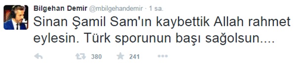 Bilgehan Demir, "Sinan Şamil Sam'ın kaybettik Allah rahmet eylesin. Türk sporunun başı sağolsun...." ifadelerini kullandı.