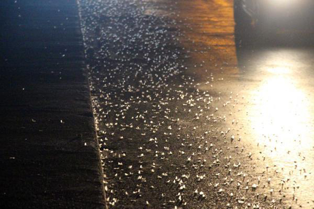 Çiftleşme uçuşu yaptıktan sonra yere düşüp ölen sinekler, yolda beyaz bir örtü oluşturdu.