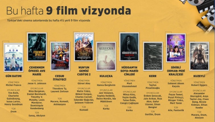 Sinemalarda hangi filmler var? Sinemalarda bu hafta ne var? sorusu sinemaseverler tarafından bir hayli araştırılmakta. Vizyondaki filmler, en son çıkan, en yeni filmler, güncel Hollywood ve Türk filmleri sinema severlerce araştırılmakta. Bu hafta vizyona 4’ü yerli 5’i yabanca 9 film girdi. Bu hafta sinemalarda Oscar ödüllü oyuncuların yer aldığı Kuzeyli liste başı olurken, Cehennem Öfkesi: Ave Marie ve Gün Batımı başta olmak üzere filmler gösterime girecek. Peki bu hafta gösterime girecek filmlerin konuları neler? İşte sinemalarda vizyona girecek film ve konular.
