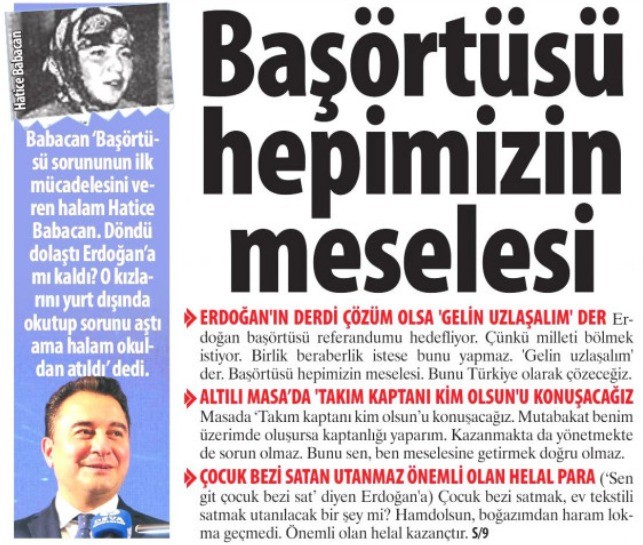 Tüm bu gelişmelere karşın DEVA Partisi Genel Başkanı Ali Babacan, bir yandan başörtüsü nedeniyle halasını okuldan atan zihniyetle yol yürürken, diğer yandan da başörtüsüne özgürlük getirerek milyonlarca genç kızın okuldan atılması tehlikesini ortadan kaldıran Cumhurbaşkanı Recep Tayyip Erdoğan'ı hedef aldı.
