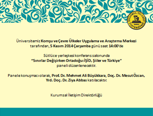 Türkiye'nin gündemini meşgul eden ve en sıcak konulardan birisi olan "Sınırlar Değişirken Ortadoğu: İŞİD, Şiiler ve Türkiye"konusunda, 5 Kasım 2014 Çarşamba günü saat 14'te Sütlüce yerleşkemizde, alanının uzman isimlerinin yer alacağı panele katılımınız bizleri onurlandıracaktır.
