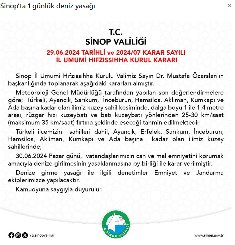 Kuvvetli fırtına nedeniyle dalga boyunun 1 ile 1,4 metre arası olacağı tahmin edildiğinden Türkeli ilçe sahilleri dahil, Ayancık, , Sarıkum, İnceburun, Hamsilos, Akliman, Kumkapı ve Ada başına kadar olan kuzey sahillerinde, Pazar günü, vatandaşların can ve mal emniyetini korumak amacıyla denize girilmesinin yasaklanması kararı alındı.