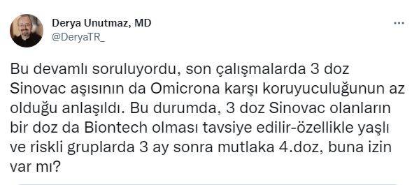 ABD’deki Türk bilim insanı Prof. Dr. Unutmaz, omicron varyantına karşın Sinovac aşısının koroyucu olup olmadığı şeklindeki soruya, “Bu devamlı soruluyordu, son çalışmalarda 3 doz Sinovac aşısının da Omicrona karşı koruyuculuğunun az olduğu anlaşıldı. Bu durumda, 3 doz Sinovac olanların bir doz da Biontech olması tavsiye edilir-özellikle yaşlı ve riskli gruplarda 3 ay sonra mutlaka 4.doz, buna izin var mı?” tavsiyesinde bulundu.