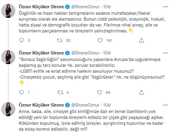 Öznur Küçüker Sirene tarafından yapılan paylaşımda, “Özgürlük ve insan hakları tartışmalarını sadece muhafazakar/liberal ayrışması olarak ele alamazsınız. Bunun ciddi psikolojik, sosyolojik, hukuki, hatta siyasi ve demografik boyutları da var. Fikrimce nihai amaç, aile ve toplumların parçalanması ve bireylerin yalnızlaştırılması. ‘Sonsuz özgürlüğün’ savunuculuğunu yapanlara Avrupa'da uygulanmaya başlamış şu tarz konular hakkında sorular sorabilirsiniz: -LGBTİ evlilik ve evlat edinme hakkını savunuyor musunuz? -Cinsiyetsiz çocuk, seçilmiş aile gibi ‘özgürlükler’ hakkında ne düşünüyorsunuz? Anne, baba, aile, cinsiyet gibi kimliğimize dair en temel özelliklerin yok edildiği yeni bir toplumda bireylerin köksüz bir çiçek gibi yaşayacağı aşikar. Kökünden kopulmuş, izole edilmiş bireyler, ayrıştırılmış toplumlar ne kadar da kolay kontrol edilebilir, değil mi?” ifadelerini kullandı.