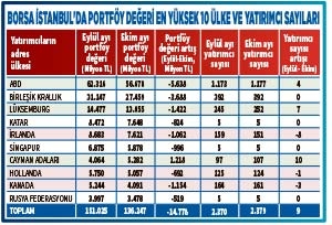 Borsaya eylül-ekimde vergi cenneti olarak bilinen Cayman Adalarından 10 yeni yatırımcı geldi. Cayman merkezli portföy büyüklüğü 1.2 milyar TL artarak 5.3 milyar TL oldu. ABD’den dört, Lüksemburg’dan da yedi yeni fon borsadan alım yaptı. Bununla birlikte Amerika, Birleşik Krallık ve Lüksemburg fonlarının toplam portföy değeri bu dönemde 10 milyar 748 milyon TL azaldı.