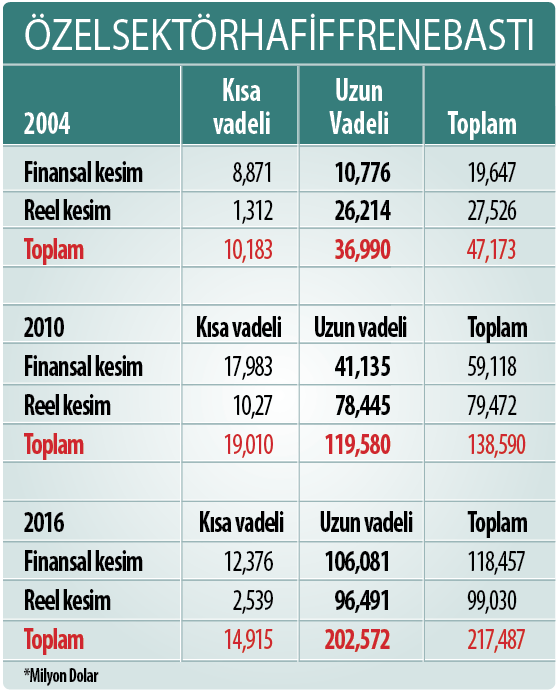 Geçen yılın sonunda ise dengenin biraz değiştiği, bankaların yurtdışından daha fazla kaynak temin ettiği görüldü. Buna göre, finansal kesimin kısa vadeli borçları Aralık 2016 itibariyle 12,4 milyar dolar, özel sektörün 2.5 milyar dolar olarak gerçekleşti. Uzun vadelilerde ise finansal kesim 106,1 milyar dolar, şirketler 96,5 milyar dolar borçlandı. Böylelikle finansal kesimin yurt dışından temin ettiği kaynak 118,5 milyar dolar, özel sektörün 99,5 milyar dolar oldu. Uzun vadeli dış borçlar alacaklıya göre incelendiğinde, en fazla borcun ticari bankalar, yurtdışı şube ve iştirakler, bankacılık dışı finansal kuruluşlardan oluşan özel alacaklılardan kaynaklandığı görüldü. Özel alacaklılardan temin edilen dış kaynak, 202,6 milyar doların 148,2 milyar dolarını oluşturdu.