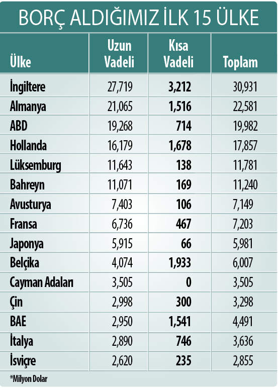 Finansal ve finansal olmayan kesimin en fazla borçlandığı ülkelere bakıldığında, İngiltere ilk sırada yer aldı. Buna göre, uzun vadeli 27,7 milyar dolar, kısa vadeli 3,2 milyar dolar olmak üzere İngiltere’ye borç 30,9 milyar dolar olarak gerçekleşti. Bu ülkeyi Almanya, 22,6 milyar dolarla takip ederken, ABD 19,9 milyar dolarla üçüncü sırada izledi. Hollanda, en fazla dış finansmanın sağlandığı Avrupa ülkeleri arasında dördüncü sırada geldi. Söz konusu ülkeye uzun vadeli 16,1 milyar dolar, kısa vadeli 1,6 milyar dolar olmak üzere toplam borç 17,8 milyar dolar olarak gerçekleşti. Lüksemburg 11,7 milyar dolarla beşinci sırada geldi. Basra Körfezi’nde ada ülkesi Bahreyn 11,2 milyar dolarla en fazla yurtdışı kaynak temin edilen ilk 10 ülke arasında altıncı sırada gelirken, bu ülkeyi Avusturya 7,1 milyar dolarla takip etti. Avrupa’nın başkenti Belçika’dan sağlanan kaynak 6 milyar dolar olurken, bu rakam Çin’den 3,2 milyar dolar, BAE’den 4,4 milyar dolar, İtalya’dan 3,6 milyar dolar, İsviçre’den 2.8 milyar dolar olarak gerçekleşti.