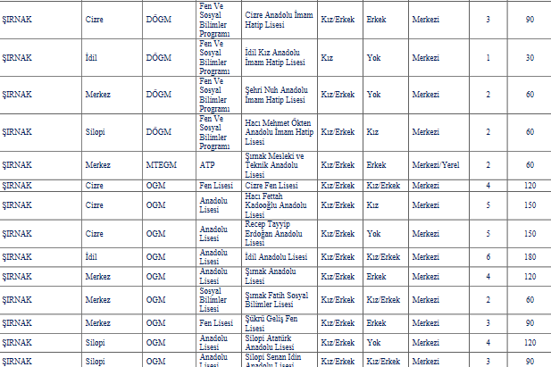 Şırnak liseleri taban puanı 2021, Şırnak liseleri başarı sıralaması ve liseleri kontenjanları nelerdir?