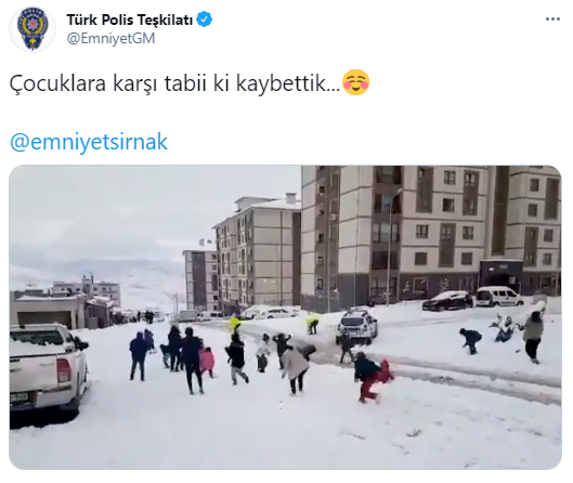 Şırnak’ta kısıtlama gününde çocuklar ve polislerin kartopu savaşında çekilen görüntüler, Emniyet Genel Müdürlüğü, Şırnak İl Emniyet Müdürlüğü ve Şırnak Valisi Ali Hamza Pehlivan olmak üzere çok sayıda sosyal medya haspaların da paylaşım rekoru kırdı. Şırnak’ta kayda geçen görüntüler yürekleri ısıttı. Mahalle’de korona virüs tedbirleri kapsamında uygulanan sokağa çıkma kısıtlamasında çocuklar ve trafik polisi ekipleri kartopu oynamaları renkli görüntüler oluşturdu.