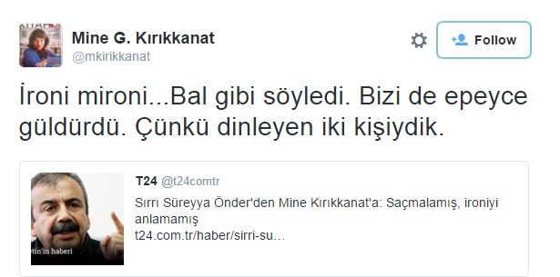 HDP Ankara Milletvekili Sırrı Süreyya Önder, Cumhuriyet yazarı Mine Kırıkkanat'ın kendisine atfederek köşesinde yer verdiği "Türklerle Kürtlerin ortak genleri yavş..klık" dediği iddiasını yanıtladı. T24'ün ulaştığı Önder, "Kırıkkanat'ın sözlerindeki ironiyi anlamadığını, saçmaladığını" savundu.
