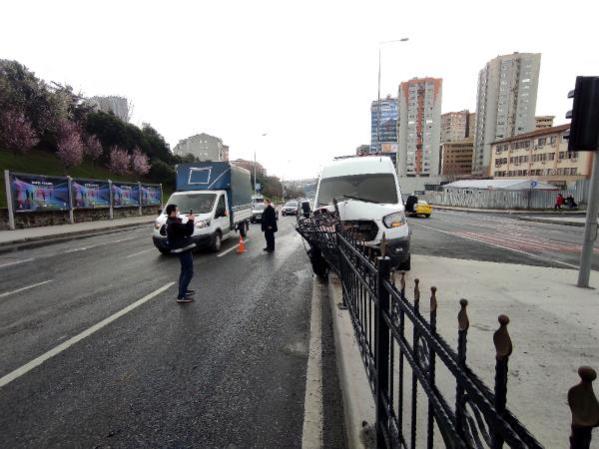 İstanbul Şişli'de aniden manevra yapan otomobile çarpan polis minibüsü, demir korkuluklara girdi.