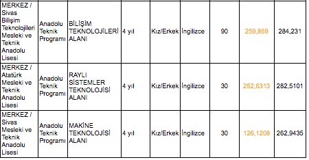 MERKEZ / Sivas Bilişim Teknolojileri Mesleki ve Teknik Anadolu LisesiAnadolu Teknik Programı taban puanları