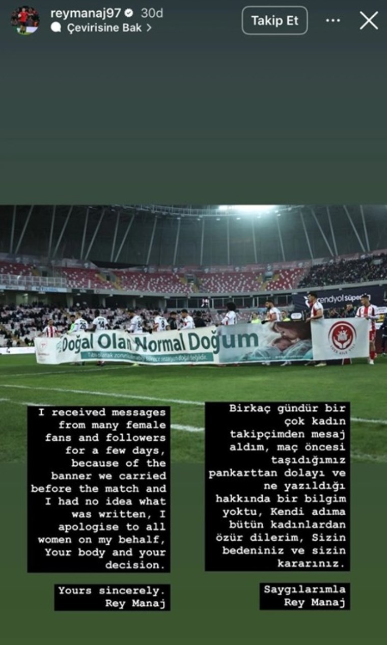 Sivasspor- Fenerbahçe maçında açılan ve tepki çeken "Doğal olan normal doğum" pankartı üzerine Sivasspor'un yıldız ismi Rey Manaj'dan özür açıklaması yaptı. Arnavut futbolcu, "Kendi adıma bütün kadınlardan özür dilerim, sizin bedeniniz ve sizin kararınız" dedi.