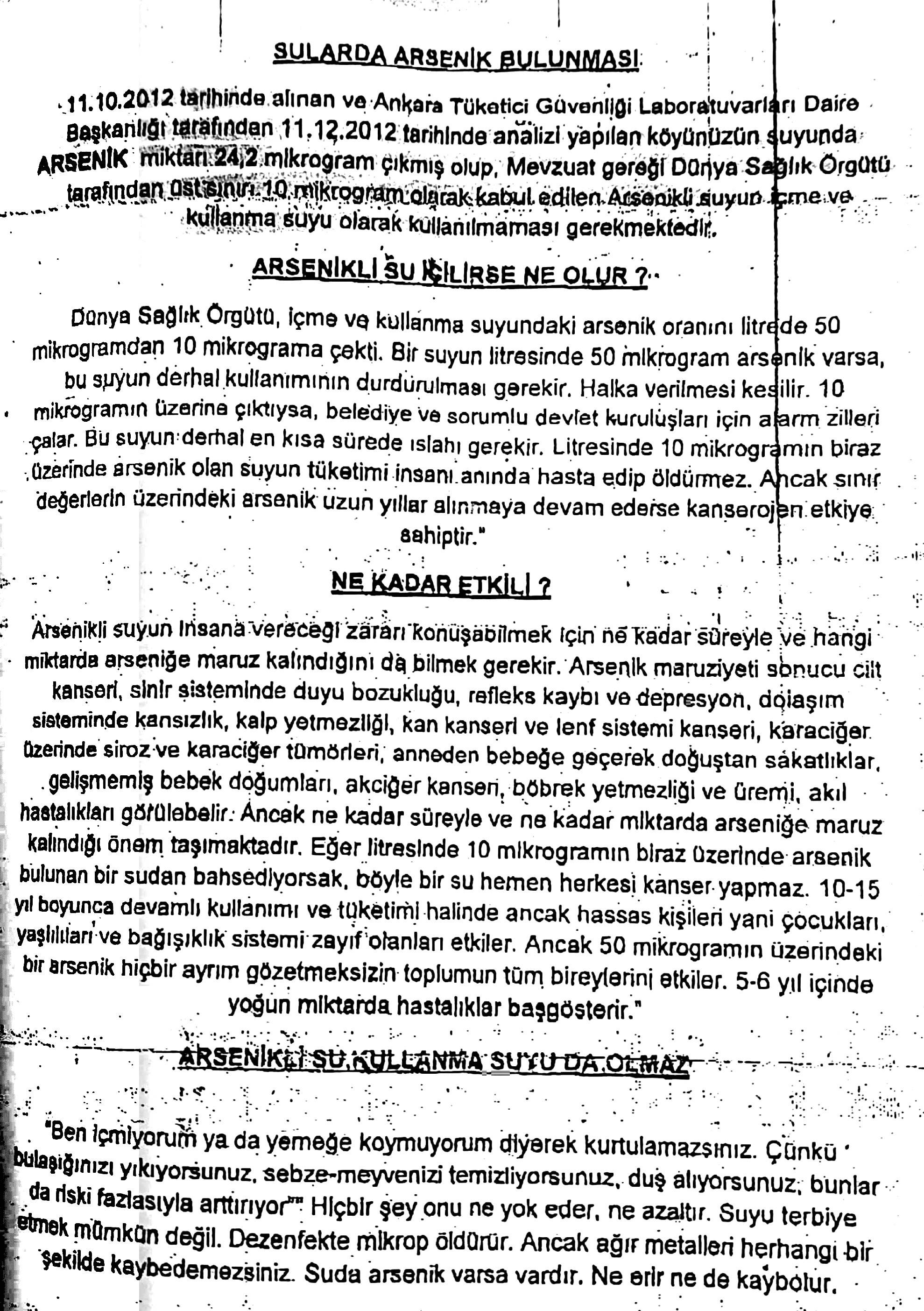 07.03.2013 tarihli raporda Toplum Sağlığı Merkezi Hekimi Dr. Ahmet Özgür, Sağlık Memuru Talat Birincioğlu, Kangal Özel İdare Müdür Vekili Aydın Yıldız ve dönemin Pınargözü Köyü Muhtarı İrfan Sönmez’in imzası bulunuyor. Raporda, Kangal Özel İdare Müdürlüğü ile birlikte köy vemezralara gidilerek köylülere arseniğin zararları hakkında bilgilendirme yapıldığı vurgulanırken, arsenikli suyun içme ve kullanma suyu olarak kullanılmaması konusunda uyarılarda bulunulduğu belirtiliyor. Sağlık ekiplerinin köylülere arseniğin zararlarına ilişkin dağıtılan bildirisinde şu korkunç sözler bulunuyor: “Arsenik maruziyeti sonucu cilt kanseri, sinir sisteminde duyu bozukluğu, refleks kaybı ve depresyon, dolaşım sisteminde kansızlık, kalp yetmezliği, kan kanseri ve lenf sistemi kanseri, karaciğer. üzerinde siroz ve karaciğer tümörleri, anneden bebeğe geçerek doğuştan sakatlıklar, gelişmemiş bebek doğumları, akciğer kanseri, böbrek yetmezliği ve üremi, akıl hastalıkları görülebilir. Ancak ne kadar süreyle ve ne kadar miktarda arseniğe maruz kalındığı önem taşımaktadır.”