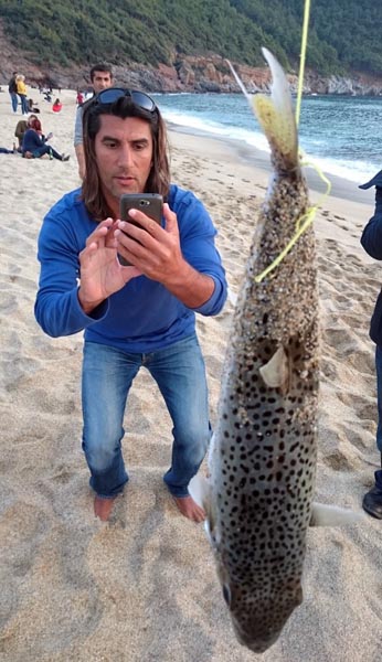 Sahilde balon balığını cep telefonu ile görüntüleyen Yunus Yavuz, arkadaşlarının kıyıya vuran bir balon balığı bulduğunu söyledi. Yavuz, ”Balık halen canlı durumda ve bayağı büyük, 50 cm falan var. Siyanürden çok çok daha zehirli olduğu söyleniyor. Bu balık Uzak Doğu’da daha çok tanınıyor. Oranın özel aşçıları tarafından hazırlanarak yeniliyor. Türkiye’de halen bu alanda çalışma yok” dedi.
