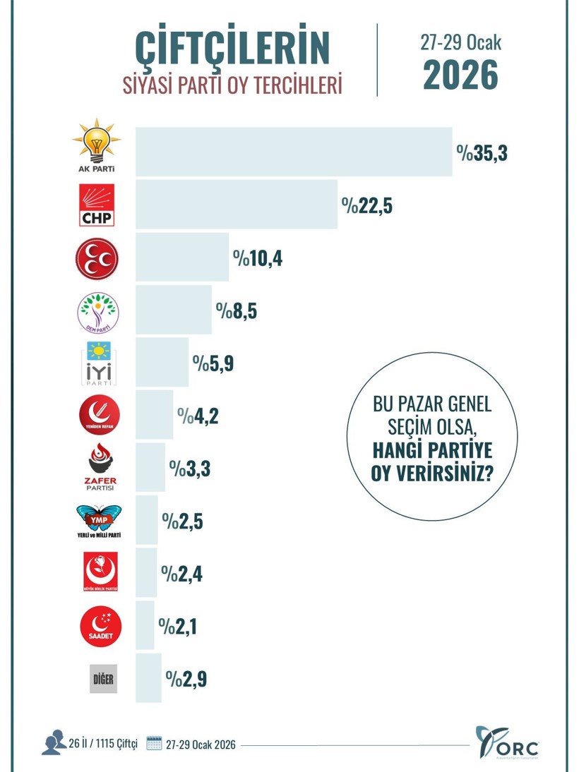 TÜRKİYE'nin önünde 2028 yılında genel seçimler var. ORC anket şirketi siyasi eğilimleri belirlemek için anket yaptı. Bu anket çiftçi kesiminin tercihini belirlemek amacıyla yapıldı. Bakın çiftçi kime oy veriyor?