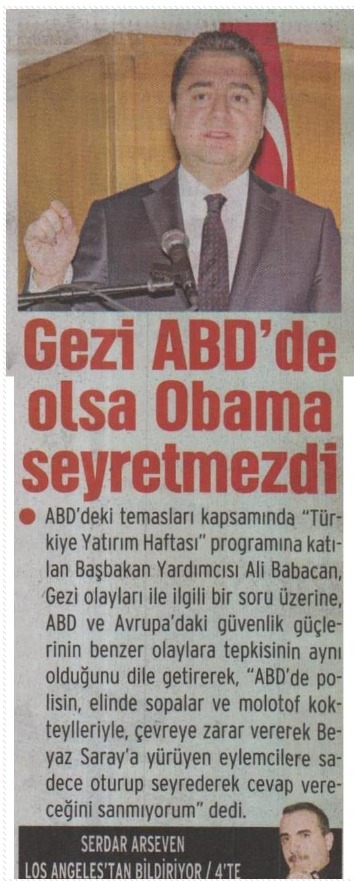 Babacan, Gezi olaylarının yaşandığı dönemde, Başbakan Yardımcısı iken, "ABD’de polisin, elinde sopalar ve molotofkokteylleriyle, çevreye zarar vererek Beyaz Saray’a yürüyen eylemcilere sadece oturup seyrederek cevap vereceğini sanmıyorum." demişti.