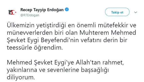 Cumhurbaşkanı Erdoğan, “Ülkemizin yetiştirdiği en önemli mütefekkir ve münevverlerden biri olan Muhterem Mehmed Şevket Eygi Beyefendi'nin vefatını derin bir teessürle öğrendim. Mehmed Şevket Eygi'ye Allah'tan rahmet, yakınlarına ve sevenlerine başsağlığı diliyorum.” ifadelerini kullandı.