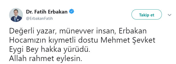 Yeniden Refah lideri Fatih Erbakan, “Değerli yazar, münevver insan, Erbakan Hocamızın kıymetli dostu Mehmet Şevket Eygi Bey hakka yürüdü. Allah rahmet eylesin.” mesajı yayınladı.