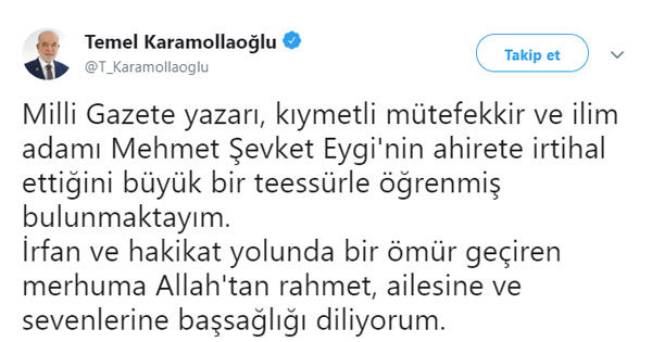 Karamollaoğlu, “Milli Gazete yazarı, kıymetli mütefekkir ve ilim adamı Mehmet Şevket Eygi'nin ahirete irtihal ettiğini büyük bir teessürle öğrenmiş bulunmaktayım. İrfan ve hakikat yolunda bir ömür geçiren merhuma Allah'tan rahmet, ailesine ve sevenlerine başsağlığı diliyorum.” diye yazdı.