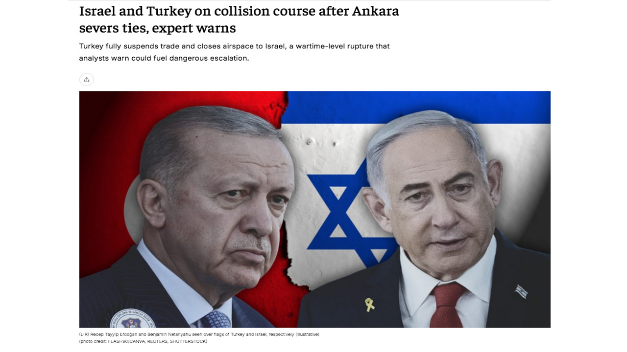 Türkiye’nin İsrail ile tüm ekonomik ve ticari ilişkileri askıya alması ve hava sahasını kapatmasının ardından İsrail basınında dikkat çeken analizler yayımlandı. The Jerusalem Post, Türkiye’nin adımlarını “savaş zamanı düzeyinde” bir kopuş olarak tanımlarken, “İsrail ile Türkiye çarpışma rotasında” ifadesini kullandı.