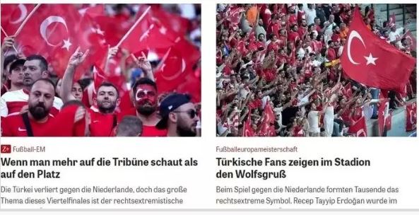 Tribünlerde ve caddelerde bozkurt selamı veren binlerce Türk taraftarı hedef alan Alman gazetesi, "Cumartesi günü Olimpiyat Stadı'nda Türk milli marşı yankılanınca yüzlerce Türk taraftar Başkan Erdoğan'ın önünde Bozkurt selamı verdi" dedi.