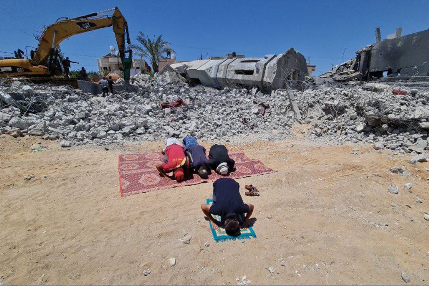 Bir yandan yaralarını sarmaya çalışan Gazzeliler bugün işgal rejimi tarafından bombalanarak yıkılan Nasr Camii'nin enkazı önünde ezan okuyarak saf tuttu.