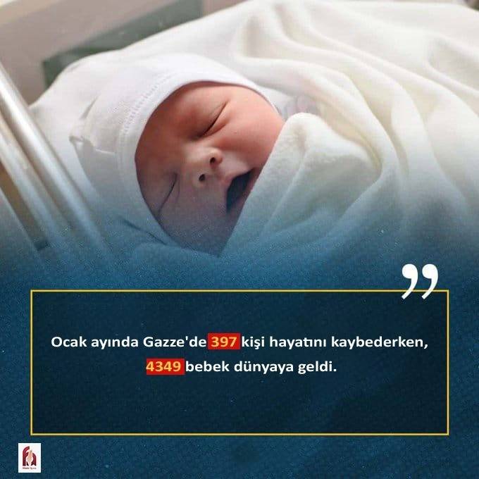 Ancak Filistin Ajansı’nın duyurduğu son ölüm ve doğum oranları Siyonistlerin tüm hesaplarını alt üst ediyor. Gazze’ye ilişkin açıklanan verilere göre, Ocak ayında Gazze'de 397 kişi hayatını kaybederken, 4349 bebek dünyaya geldi. Her türlü zorluğa ve yokluğa rağmen hayata gözlerini açan Filistinli 4349 masum bebek, Filistin halkına da yeni umutların habercisi oldu.