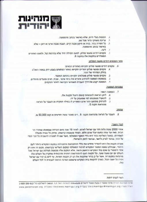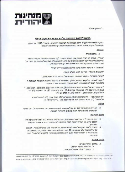 Elde edilen bilgilere göre Likud Partisi'nin içinde yer alan ve kendilerini Minhijot Yahudit olarak adlandıran bir grubun lideri olan Muşih Vijlin Kinisit'in Mescid-i Aksa'yı bölme yönündeki kanun tasarısını Kinisit'te (Meclis) sunmak için Yahudi Diyanet İşleri Başkanının masasına bıraktığı belirtildi. Kararın yasa olarak kabul edilmesini yönünde çalışmalar düzenleyen grup, İsrail hükümetinin de desteğiyle bu tasarıyı kanunlaştırmaya çalışıyor.