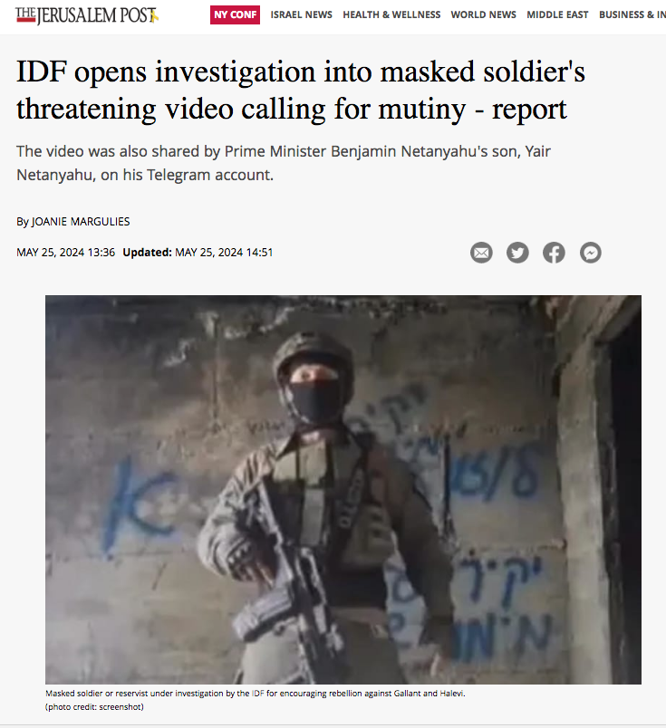 Gazze’deki soykırımını sürdüren Siyonist orduda bir asker, video çekerek, Savunma Bakanı Gallant ve Genelkurmay Başkanı Halevi’ye karşı isyan ve darbe çağrısı yaptı. Netanyahu’nun oğlu videoyu paylaştı, İsrail’de gündeme oturan video için ordu soruşturma başlattı.