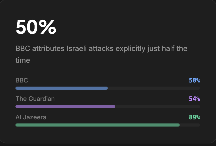 Aynı zamanda BBC’nin İsrail kaynaklı saldırıları açık şekilde atfetme oranının yaklaşık yüzde 50’de kaldığı, bu oranın Sky News ve The Guardian’da yüzde 54, Al Jazeera’da ise yüzde 89 olduğu tespit edildi.
