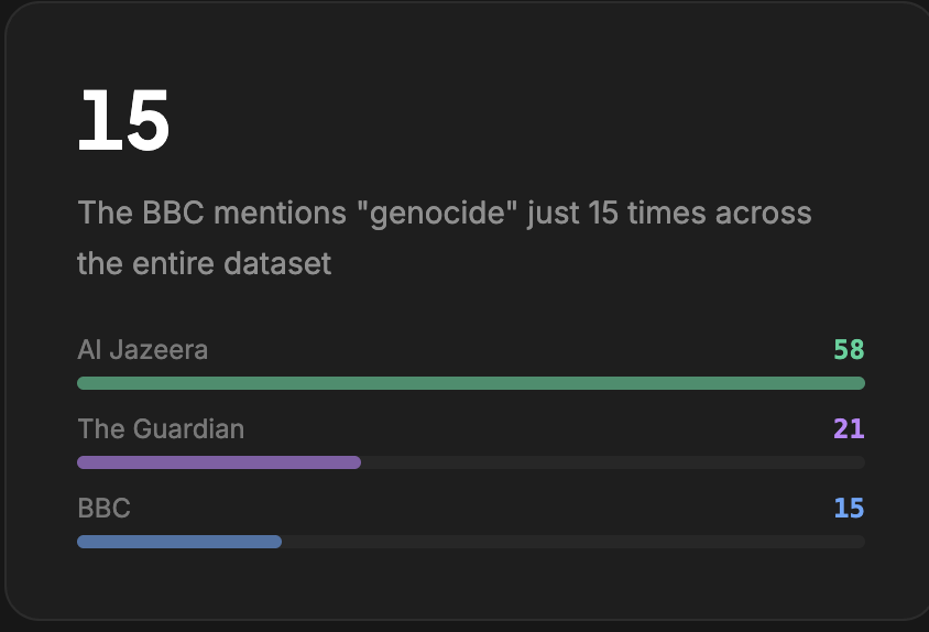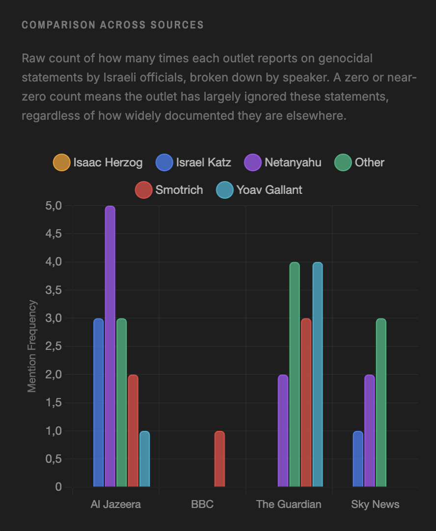 Araştırmada BBC’nin, İsrailli yetkililer tarafından yapılan yüzlerce “soykırım” içerikli açıklamaya rağmen bu tür ifadelerden yalnızca birine haberlerinde yer verdiği belirtildi. Law for Palestine verilerine göre İsrailli liderler tarafından 500’ün üzerinde bu tür açıklama yapıldığı ifade edildi.