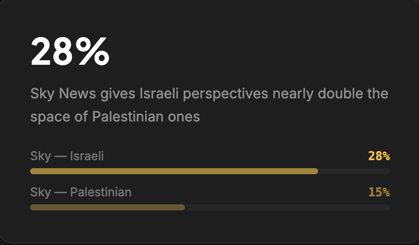 Çalışmada, haberlerde yer verilen aktörlerin temsiline ilişkin de dikkati çekici veriler paylaşıldı. Sky News’in içeriklerinde İsrailli perspektiflere ayrılan kelime oranının yüzde 28 olduğu, Filistinli görüşlerin ise yüzde 15’te kaldığı kaydedildi.