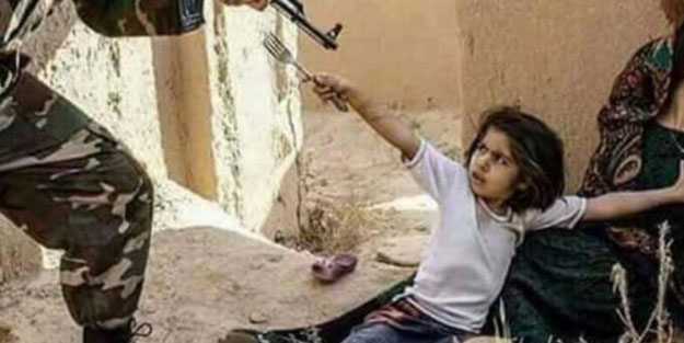 Bir fotoğraf karesinde Siyonist işgal gücünün Filistinli kıza silah doğrulttuğu ancak Filistinli kızın elindeki çatalla direndiği görülüyor.
