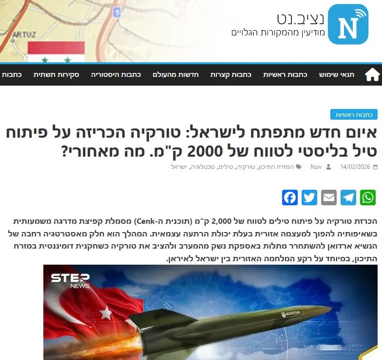 İsrail merkezli Nziv haber sitesi, "İsrail için yeni bir tehdit gelişiyor: Türkiye 2.000 km menzilli balistik füze geliştirdiğini açıkladı! Bunun arkasında ne var?" başlıklı haberinde, Cenk programının Türkiye'nin bölgesel bir güç olarak bağımsız caydırıcılık kapasitesine ulaşma hedefinde önemli bir sıçrama anlamına geldiğini belirtti.