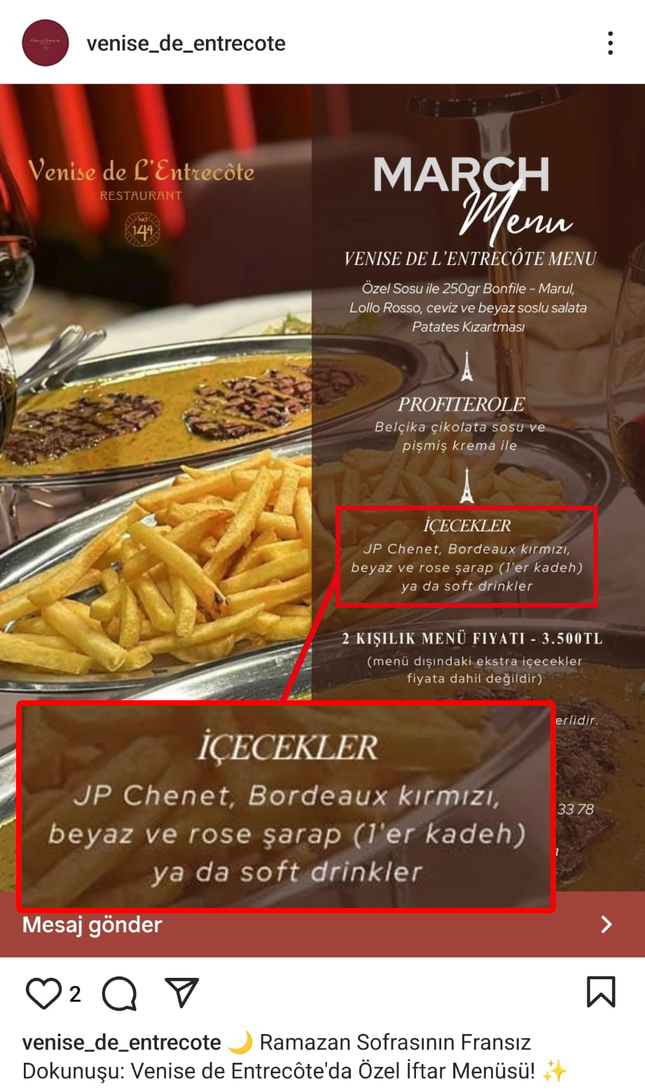 Taksim İstiklal Caddesi'nde bulunan ve Fransız mutfağı menüleri hazırladığı belirtilen Venise de L'Entrecote isimli mekan, İslam’a ve iftar geleneğine aykırı bu menüsüyle büyük bir skandala imza attı. Müslümanların hassasiyetlerini göz ardı eden bu durum, sosyal medyada büyük tepki topladı.