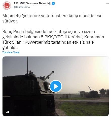 "Barış Pınarı bölgesinde taciz ateşi açan ve sızma girişiminde bulunan 5 PKK/YPG'li terörist, kahraman Türk Silahlı Kuvvetlerimiz tarafından etkisiz hale getirildi."