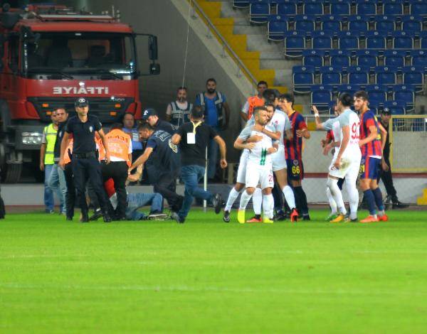 2. Lig Kırmızı Grup'ta oynanan Mersin İdmanyurdu - Amed Sportif mücadelesinde bir taraftar sahaya girerek Amed Sportif futbolcusu Deniz Naki'ye saldırdı.